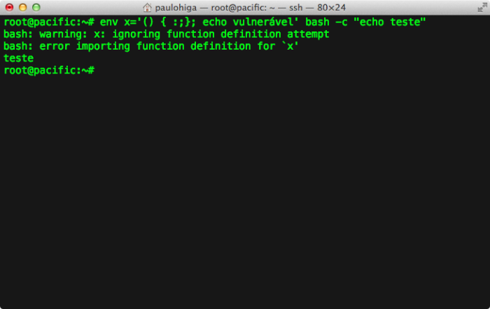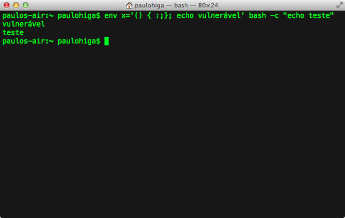 O Bash é o shell padrão em muitos sistemas operacionais baseados em Unix, o que inclui distribuições Linux e o OS X. Red Hat, CentOS, Ubuntu e Debian já ganharam correções de segurança, mas, no momento em que escrevo este parágrafo, o OS X 10.9.5, última versão disponível, está vulnerável. Para descobrir se uma máquina é afetada, basta rodar o seguinte comando no terminal: