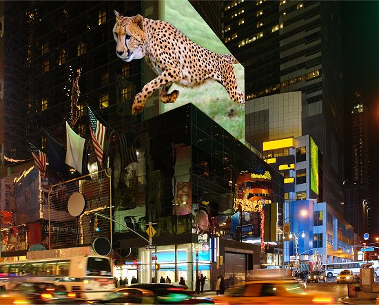A imagem acima ainda é meramente ilustrativa, mas poderá se tornar real até o ano que vem. Pelo menos esta é a promessa de engenheiros austríacos, que criaram uma técnica que permite projetar imagens 3D em outdoors e outras telas de grandes formatos, sem que os espectadores precisem usar óculos especiais.