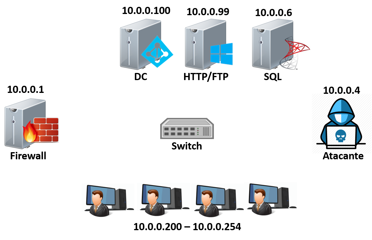 Nosso ambiente de laboratório é é o mesmo utilizado nos posts sobre o Responder, ele é bem simples, mas também bem comum pelas redes a fora. É composto por um firewall, servidores (AD, SQL, HTTP, FTP e etc..) e os clientes da rede. A imagem abaixo ilustra bem: