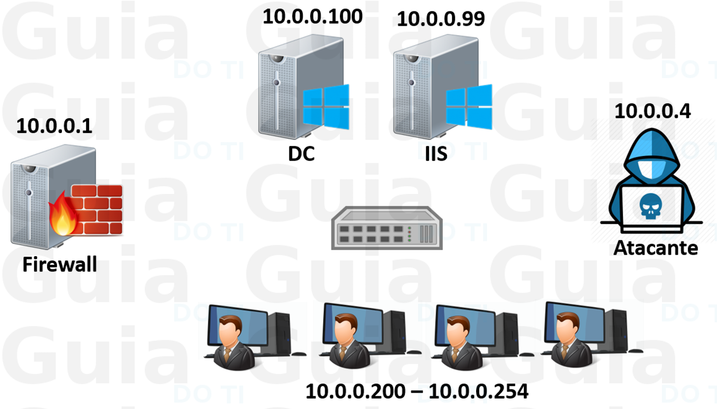 Nosso ambiente de laboratório é bem simples, mas também bem comum pelas redes a fora. É composto por um firewall, servidores (AD, SQL, HTTP, FTP e etc..) e os clientes da rede. A imagem abaixo ilustra bem: