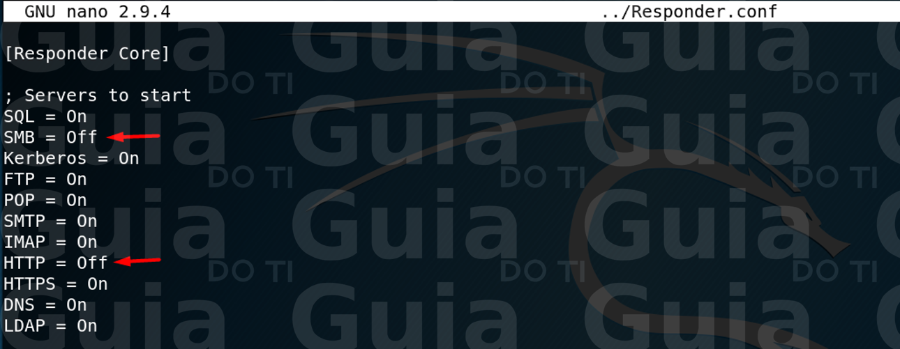 Perceba que das quatro máquinas existentes apenas uma delas está com a funcionalidade de assinatura SMB habilitada (10.0.0.100). No nosso caso esse host é o PDC, esse cenário vai se repetir muitas vezes na vida real. Agora que já sabemos quais hosts podem ser possíveis alvos vamos para o próximo passo, mudar algumas configurações no arquivo responder.conf, iremos desabilitar as funções SMB e HTTP.