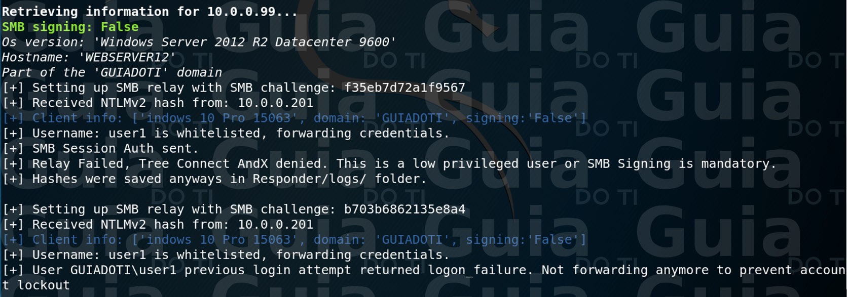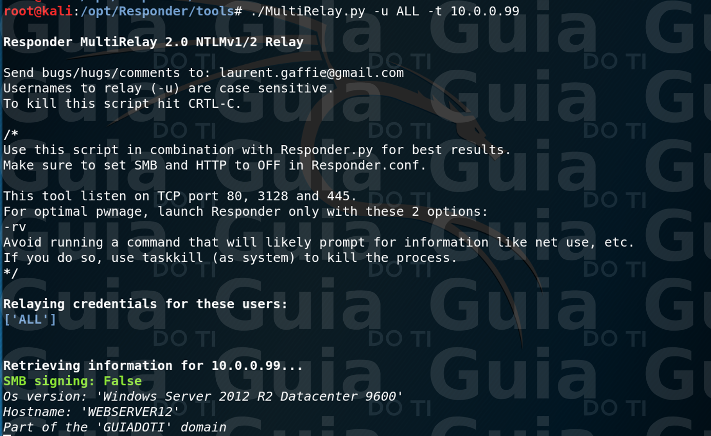 Isso é necessário por que o MultiRelay trabalha em conjunto com o Responder. Nesse cenário todas as pesquisas NBT-NS e LLMNR serão resolvidas pelo Responder para o nosso IP e o MultiRelay irá ficar escutando nas portas TCP 80, 3128 e 445 e esperando novas conexões. Uma vez que essas conexões são recebidas, o MultiRelay irá analisar todas as requisições de autenticação e irá verificar se a autenticação do usuário pode ser encaminhada para o alvo e se o usuário já foi encaminhado antes e recebeu uma falha de logon.