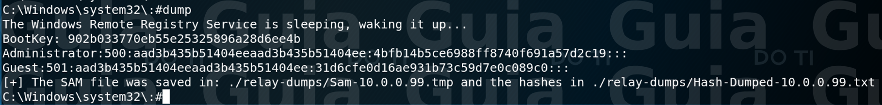 Em outro terminal iremos executar o MultiRelay definindo como alvo o ip 10.0.0.99 que foi um dos hosts da rede que identificamos com o RunFinger que não exige assinatura do SMB. Agora é só esperar que a requisição de autenticação de algum usuário privilegiado seja capturada pelo Responder para o MultiRelay poder fazer seu trabalho.