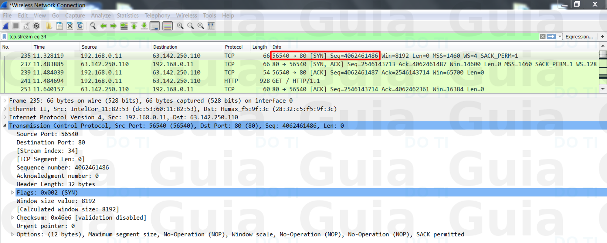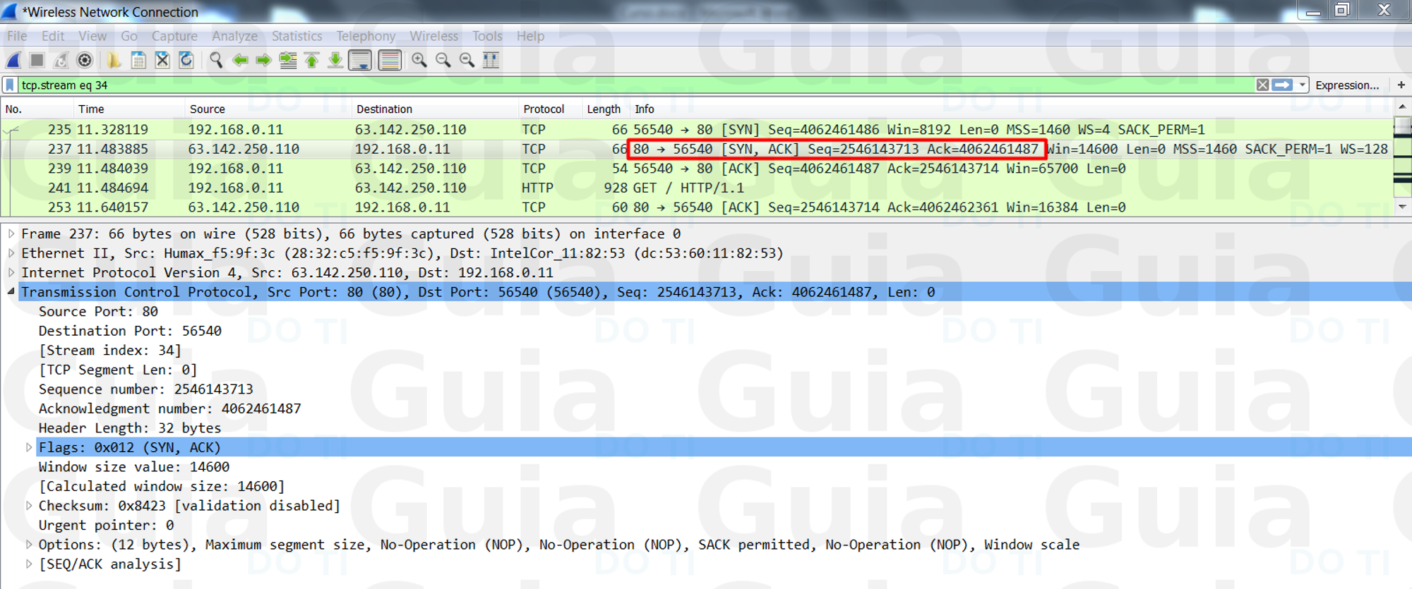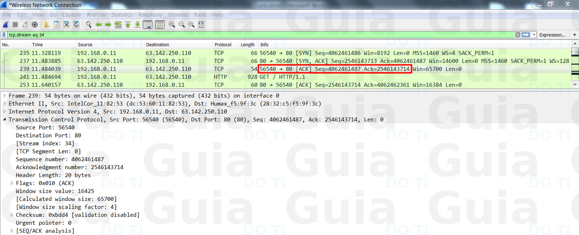 Neste ponto, o cliente e o servidor receberam um reconhecimento de conexão. As etapas 1 e 2 estabelecem o parâmetro (número de sequência) de conexão para uma direção e ele é reconhecido. As etapas 2 e 3 estabelecem o parâmetro de conexão (número de sequência) para a outra direção e ele é reconhecido. Com isto, uma comunicação full-duplex é estabelecida. PAra ficar um pouco mais visual, vamos analisar esse processo no wireshark: