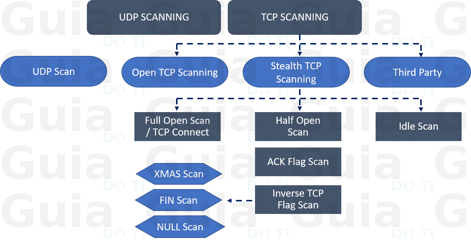 As técnicas de varredura de porta são projetadas para identificar as portas abertas em um alvo. Isto é frequentemente usado pelos administradores para verificar as políticas de segurança de suas redes e por atacantes para identificar os serviços em execução em um host com a intenção de comprometê-lo. Na imagem abaixo podemos ver as principais técnicas de scanning de redes: