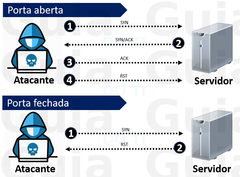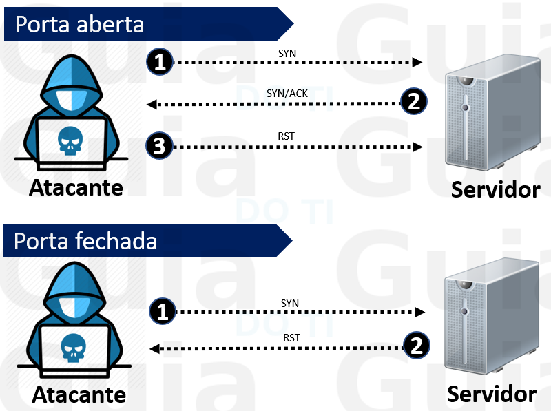 Esta técnica é frequentemente chamada de escaneamento de porta entreaberta (half-open scanning), porque você não abre uma conexão TCP completamente. Você envia um pacote SYN, como se fosse abrir uma conexão real e então espera uma resposta. Um SYN/ACK indica que a porta está ouvindo (aberta), enquanto um RST (reset) é indicativo de uma não aberta.