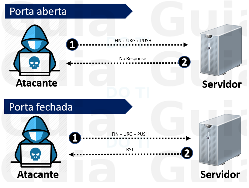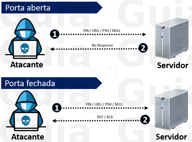 Atacantes enviam os pacotes TCP habilitando várias flags TCP (FIN, URG, PSH) ou sem nenhuma flag. Quando a porta está aberta, o atacante não recebe qualquer resposta do host, enquanto que, quando a porta está fechada, ele recebe um RST/ACK do host de destino.