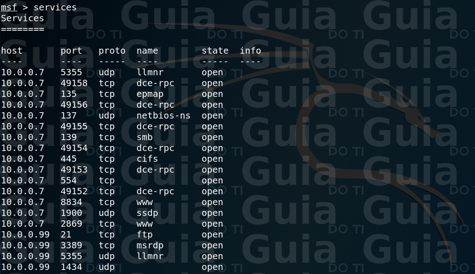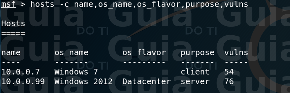 Uma vez que o relatório é importado para o banco de dados nos podemos visualizar os hosts e seus determinados serviços utilizando os comandos que já vimos no post anterior (“hosts” e “services”). Nas imagens abaixo podemos ver a saída desses comandos: