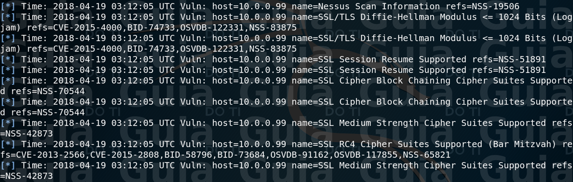 Porém, hoje iremos passar a usar um outro comando, o “vulns”. Esse comando irá listar todas as vulnerabilidades que foram reportadas no relatório do Nessus que importamos. Assim como os comandos “hosts” e “services”, o “vulns” conta com uma série de parâmetros que podem ser utilizados de acordo com nossa necessidade. Na imagem abaixo podemos ver parte da lista de vulnerabilidades existentes na base: