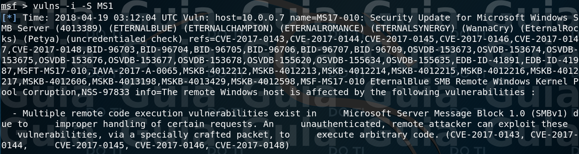 No exemplo acima podemos ver que uma das vulnerabilidades do host 10.0.0.7 é a vulnerabilidade MS17-010, essa é uma vulnerabilidade largamente conhecida (se você não conhece, pare agora de ler esse artigo e se informe sobre ela) que permite a execução de código remotamente e existe um módulo no metasploit pra ela. Basta fazer uma busca no msfconsole para encontrar o módulo: