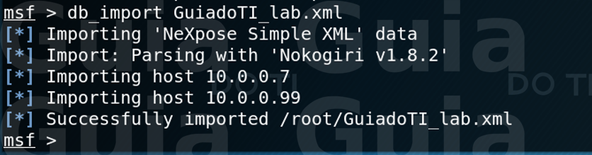 Como eu citei no início do post eu não vou ficar explicando como fazer o scan ou como exportar relatórios. Então, levando em consideração que você já realizou o scan, basta exportar o relatório no formato “.nessus”. Depois disso abra o msfconsole e importe o relatório exportado usando o “db_import” (da mesma forma que usamos para importar os relatórios do Nmap). Confira na imagem abaixo a importação do arquivo: