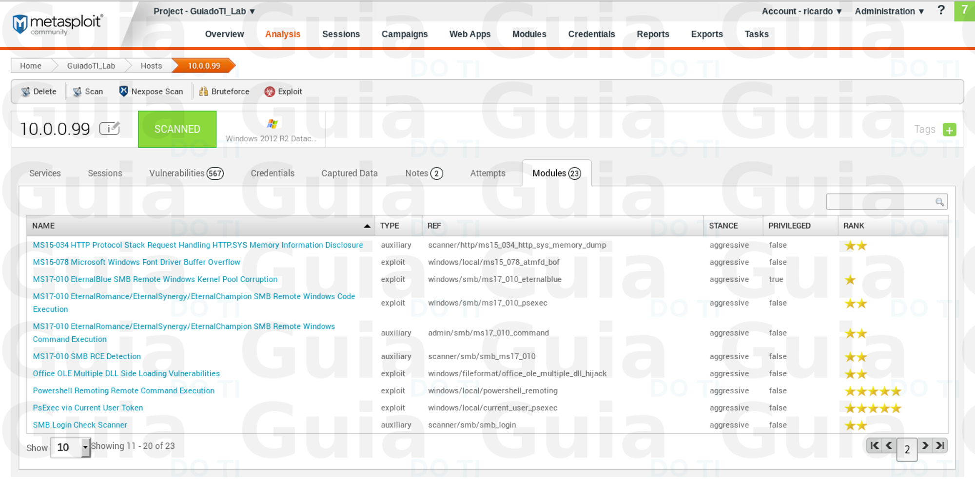 Isso é uma funcionalidade sensacional que essa versão do Metasploit nos oferece. Agora basta abrir o msfconsole e colocar a mão na massa. Esse processo nos poupa muito tempo analisando os relatórios e procurando pelos módulos corretos.
