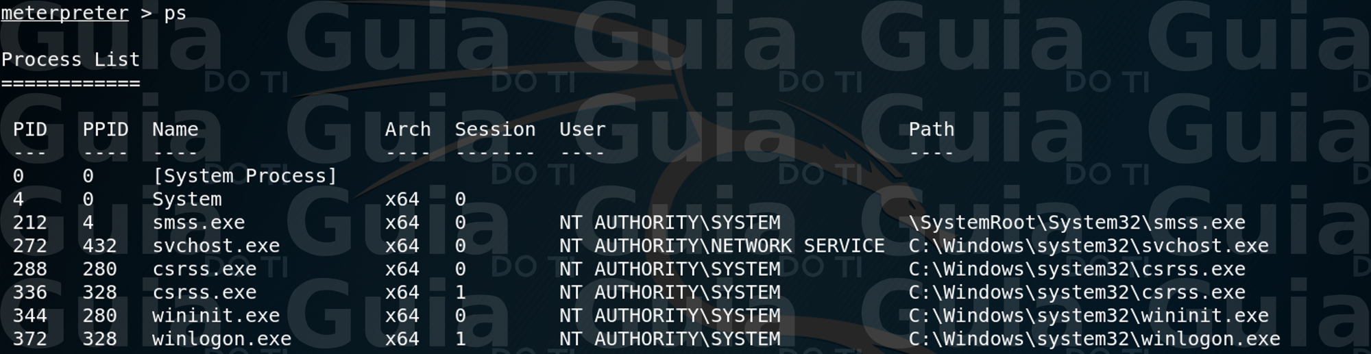 O comando ‘ps’ exibe uma lista dos processos em execução na máquina alvo.